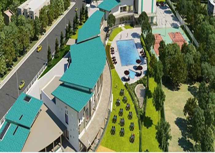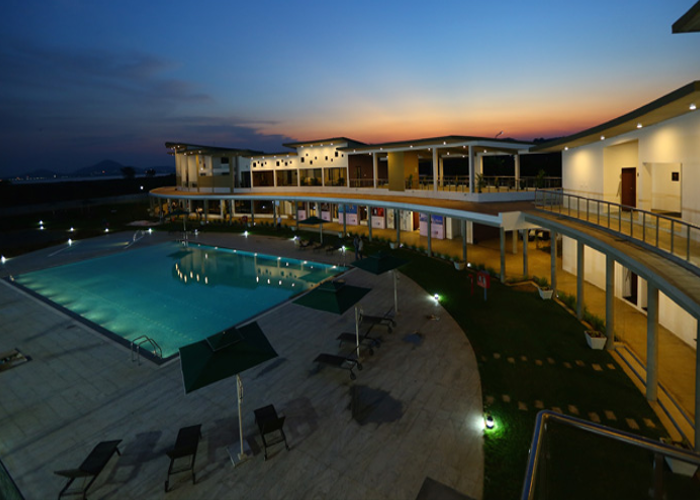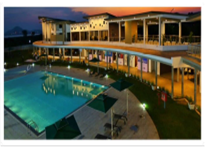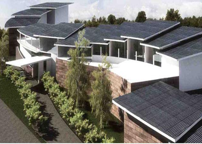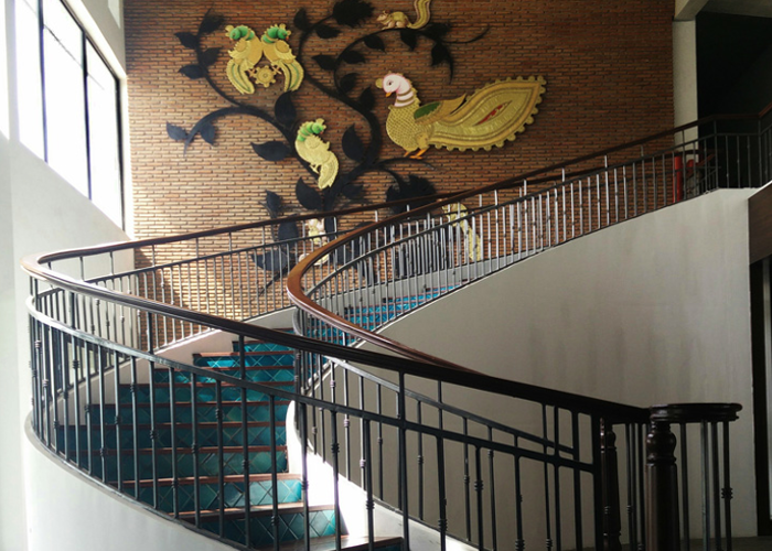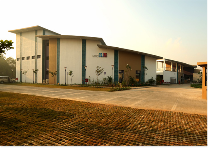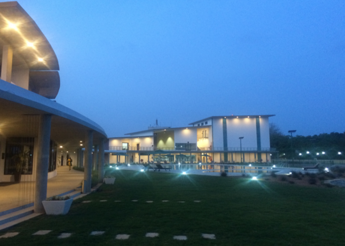 The structure is ‘S’ Shaped with slopped roof and variable heights. The entire structure is curved including RCC and Brickwork. It is a LEED certified Green Building.